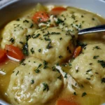 After the chicken is cooked, you shred it and return it to the pot. At this point, you mix together flour and other ingredients to create the dumpling batter. Dropping spoonfuls of this thick batter into the bubbling broth is the fun part! You’ll see them puff up as they cook, becoming soft and light. When it’s time to serve, you’ll present a steaming bowl of the savory soup with tender chicken and fluffy dumplings that everyone will want to dive into.
